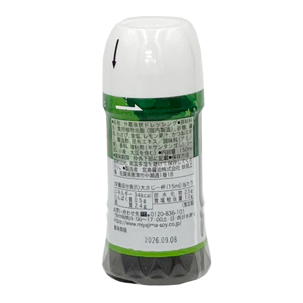 食用植物油脂(国内製造)、砂糖、醤油、わさび、食塩、レモン果汁、かつおエキス、醸造酢、昆布エキス/調味料(アミノ酸)、香料、増粘剤(キサンタンガム)、(一部に小麦・大豆を含む)